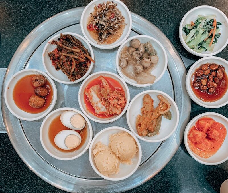 Les repas coréens sont souvent accompagnés de plusieurs petites portions de « banchan », qui sont des plats d’accompagnement. Ces petites portions sont partagées entre tous les convives et peuvent inclure du kimchi, des légumes marinés, des petits poissons, ou même des pancakes coréens appelés « jeon ».