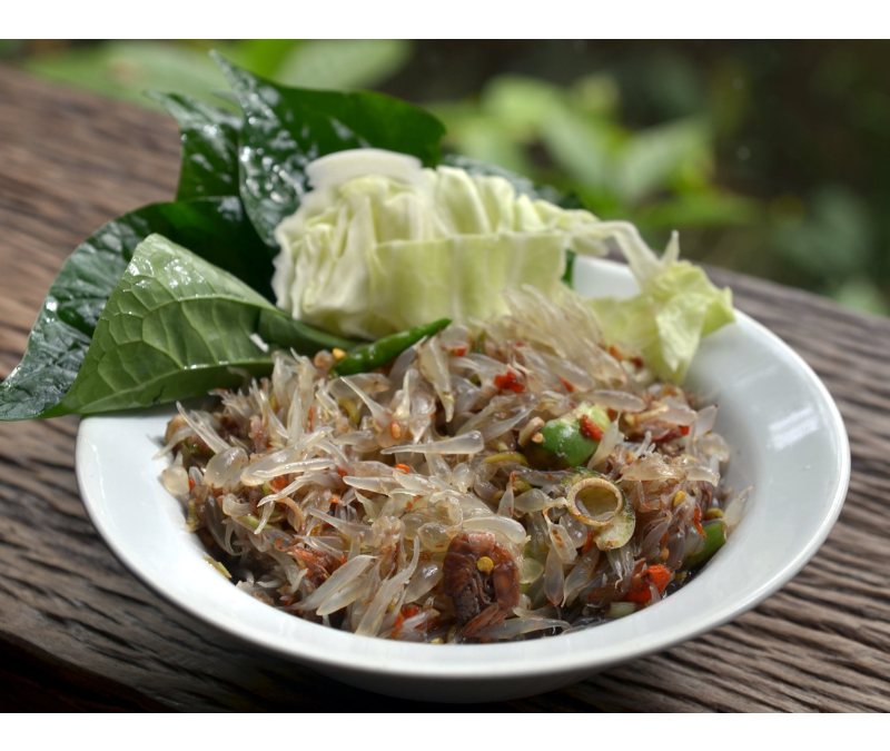 Ce plat laotien est un mélange sucré, acide et salé de pamplemousse, crevettes séchées, cacahuètes et sauce de poisson.
